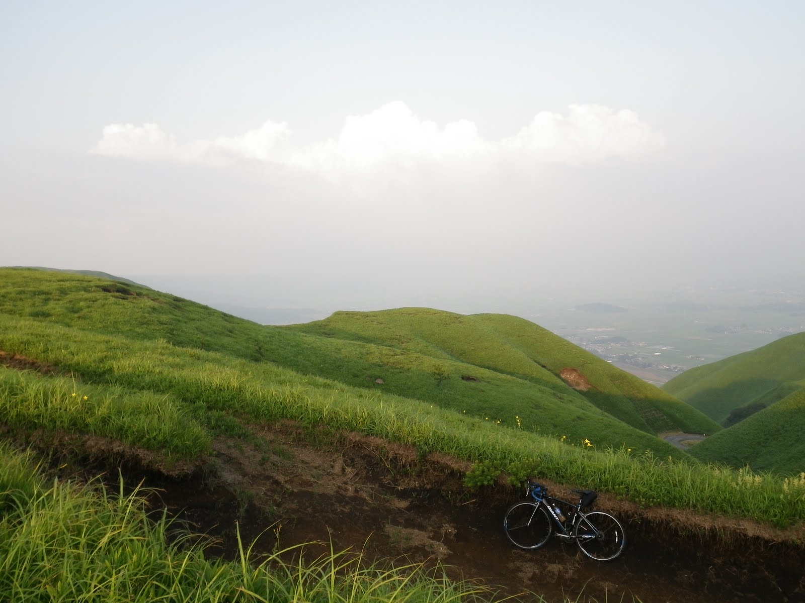 ちょっとだけ下ろうかと考えましたが、下の道からランクルがかなりの勢いで走ってきて、下りで速度が乗っていたら対向車と即衝突で即飛び阿蘇の大地に溶けていくコースになるので来た道を戻ることにしました。
