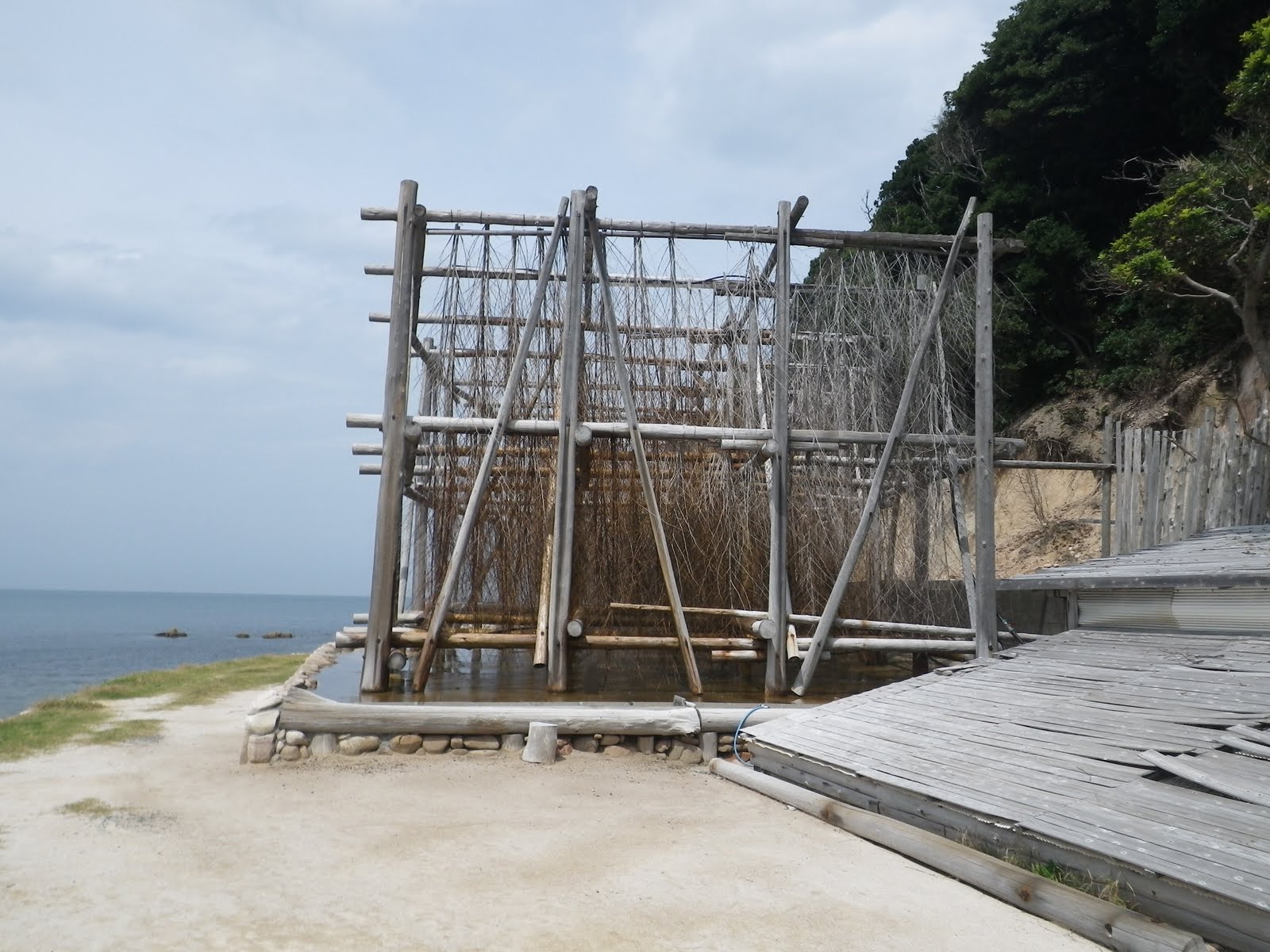 しかし、峠をくだって海沿いに出れば、少なくとも稲からは解放されるので、目的地である製塩所へいそぎます。海沿いに来ると、目的地を示す看板が見えてきました。