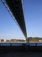 角島大橋を渡ります。風が強くて車が追い越すまで一時反対車線に待避の技を使う事になります。ディープリムはともかくとして、ディスクホイールの人は、角島大橋に挑むには相当に根性を入れて掛かった方が良いでしょう。