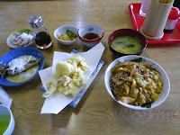 生うに・イカ丼の前に、味噌汁と小鉢がきて「あれ?」と思ったのですが、「生うに・いか丼」とあっても単品ではなく、セットのお値段だったようです。イカ天までついていて、予想外のボリューム。こ、これはこの後の自転車が厳しいことに……