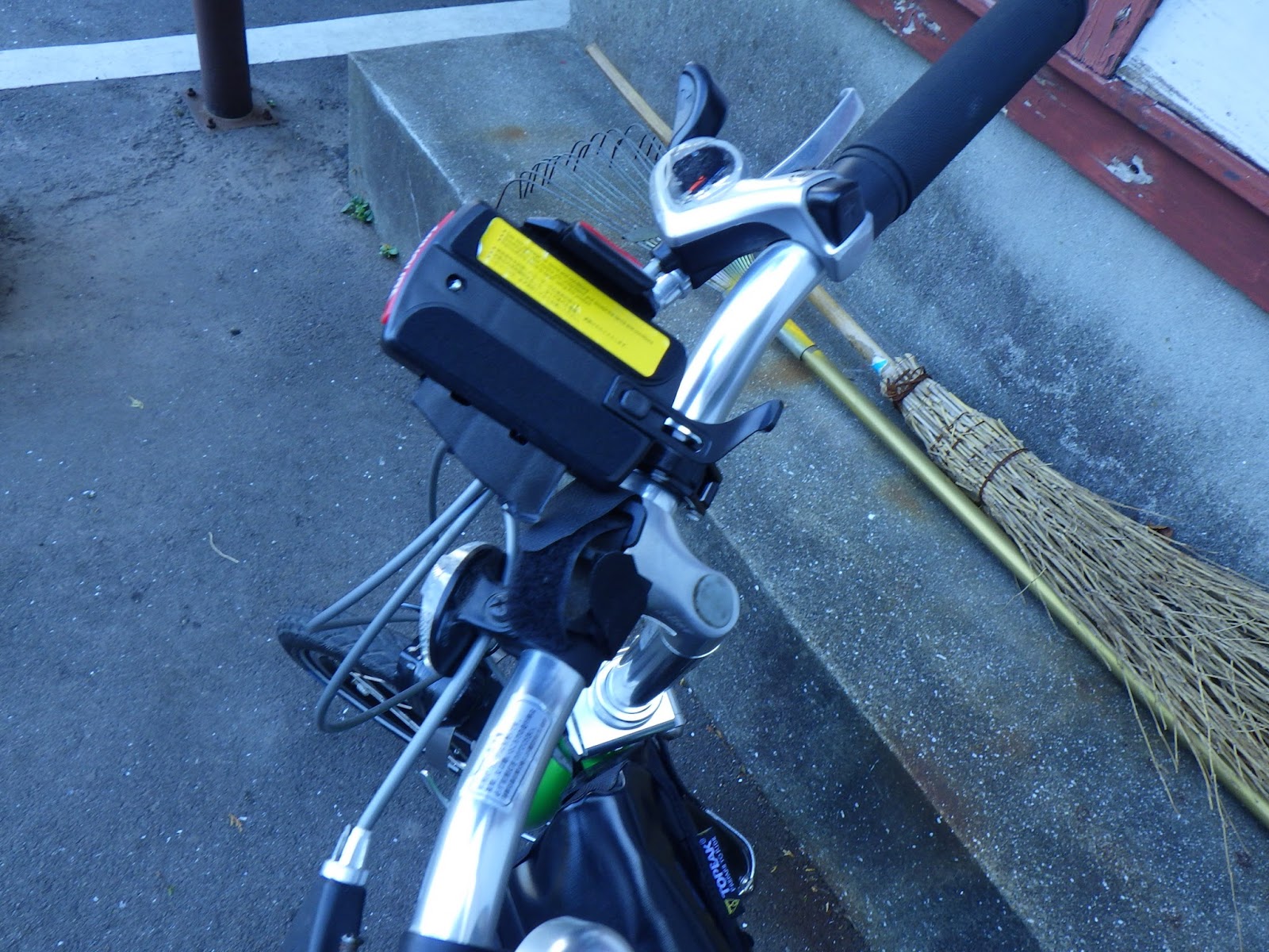 入り口の料金所? で、トイレを借りた際に自転車が転倒してスマホホルダーを破損させます。ミノウラ iH-500-OS