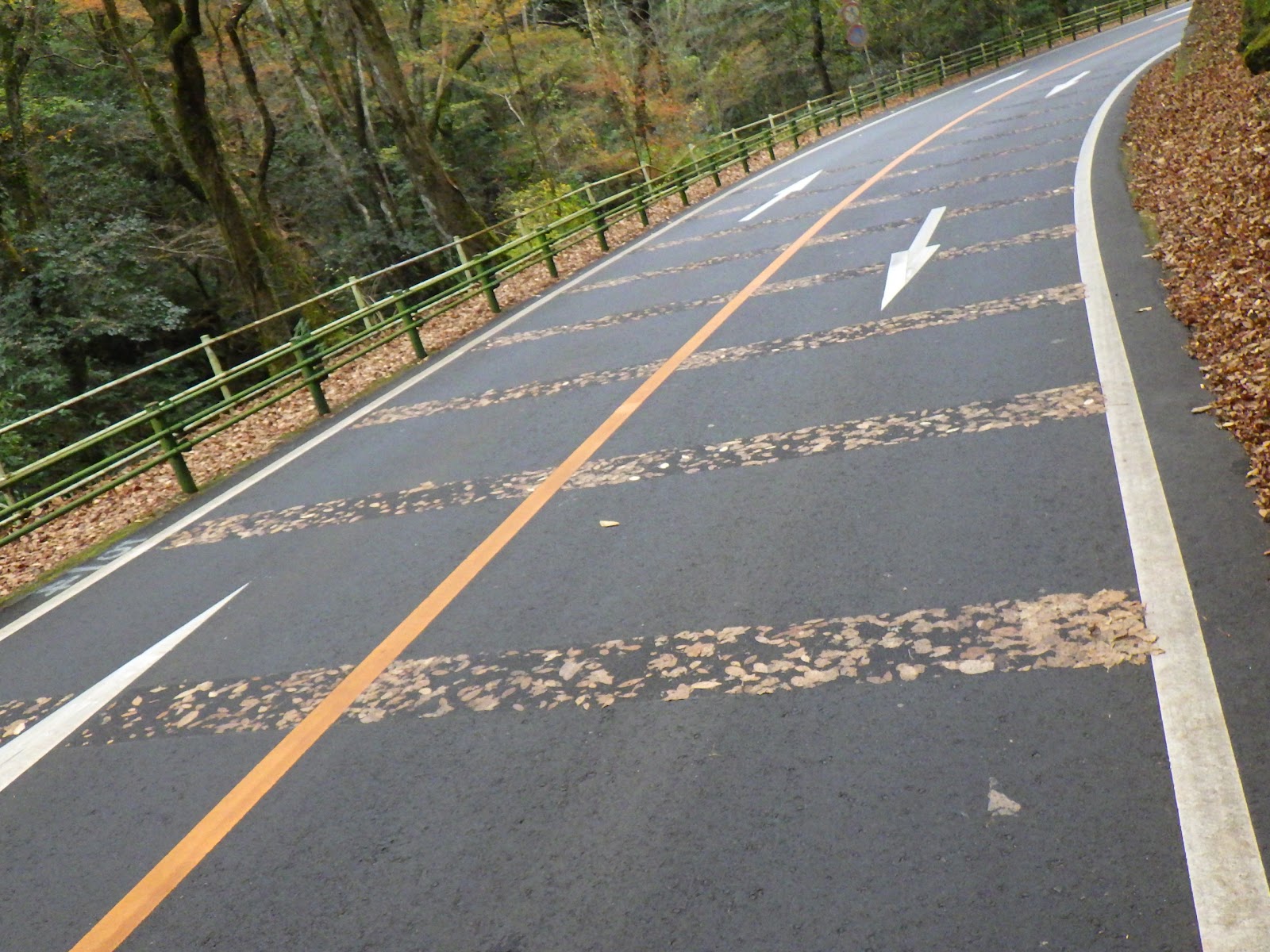 スリップ防止か音出しのための仕様が違う部分に、落ち葉が押し付けられてゼブラゾーンになっています。
