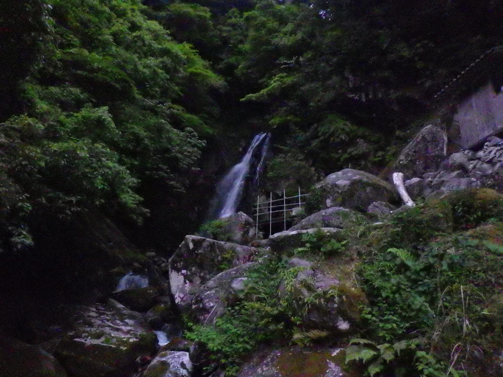 で、滝を見に行って帰ろうとなって、自転車を置いて岩場に徒歩で向かいます。林の中は暗くてビビりました。ヘッデンもってくれば良かった。レストランに入ってヘッデンで照らしてメニュー確認とかもできるかもだし。(できません)