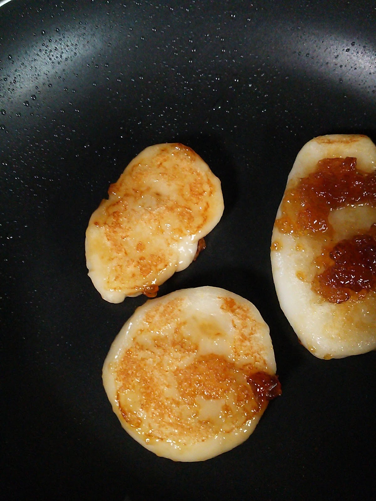 こねただんご粉ですが、水分管理に失敗して均等にわけることが困難でした。分けた団子を茹でて、そしてフライパンで焼きます。