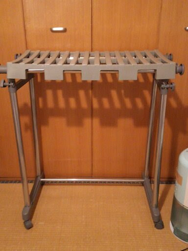 ホームセンターに行って、ソーホースっぽいものを探すと、パイプハンガーがあったので、ダブルタイプで幅や高さが調整できるものを購入しました。あとは天板かわりにプラすのこ。