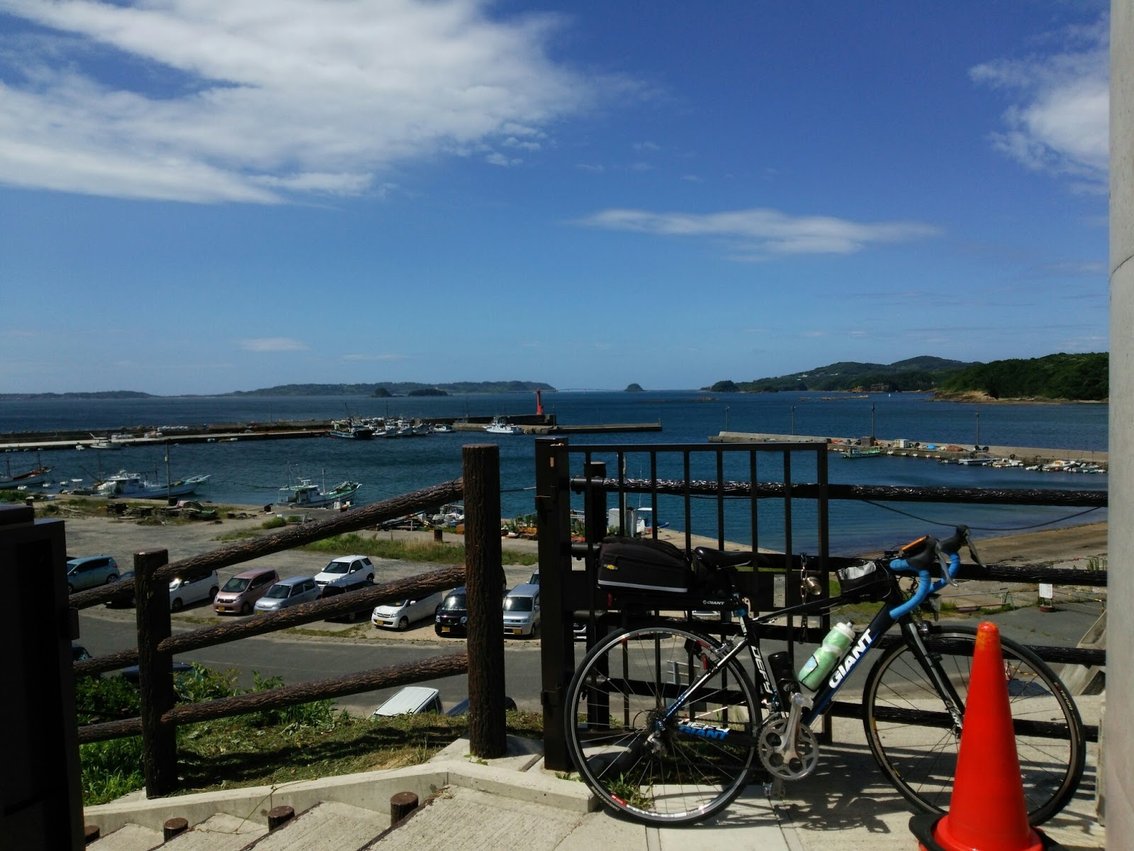 豊北の道の駅まできて、角島大橋が見えました。台風予報だったので、車は少なめでした。それでも道の駅に入るために、少し待たなければいけませんでしたが、自転車には関係がないためさくっと入ってトイレを借りて行きます。
