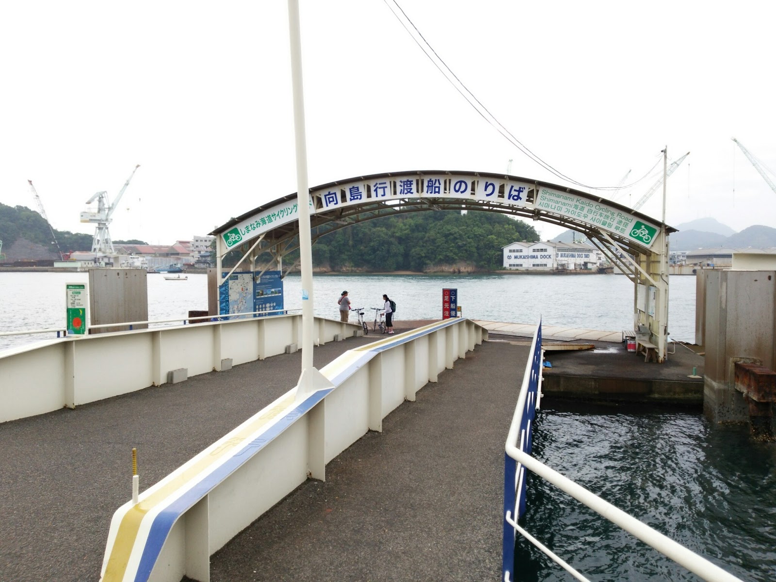向島までは渡船がいいということで、渡船への道行。7月12日の日曜でしたが、台風の予報があったのでガラガラでした。小さく写っているのは外国の方で、レンタルサイクルでしまなみ海道に挑む様子でした。他にも日程を決め打ちされていたであろう、集団、家族連れのレンタサイクル集団をぼちぼちみました。