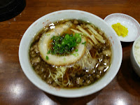 日替わり定食で800円だったか。背油が浮いているのが尾道ラーメンなんじゃろか? よくわからないまま食べました。油の層で熱は冷めにくいためか、味がうすいと感じた自分は、やはり、ダメ舌なんでしょう。家で中華味の素ふりすぎたか……