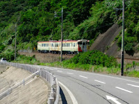 犬鳴岬(いんなきっばな、いぬなきばな)あたりで電車とすれ違いました。日曜だったため、道路には、たぶん撮り鉄の人が場所取りで複数名脚立を設置して撮影の準備をしていました。その場所を通り過ぎると、電車がいったん停車して風景を見ていました。
