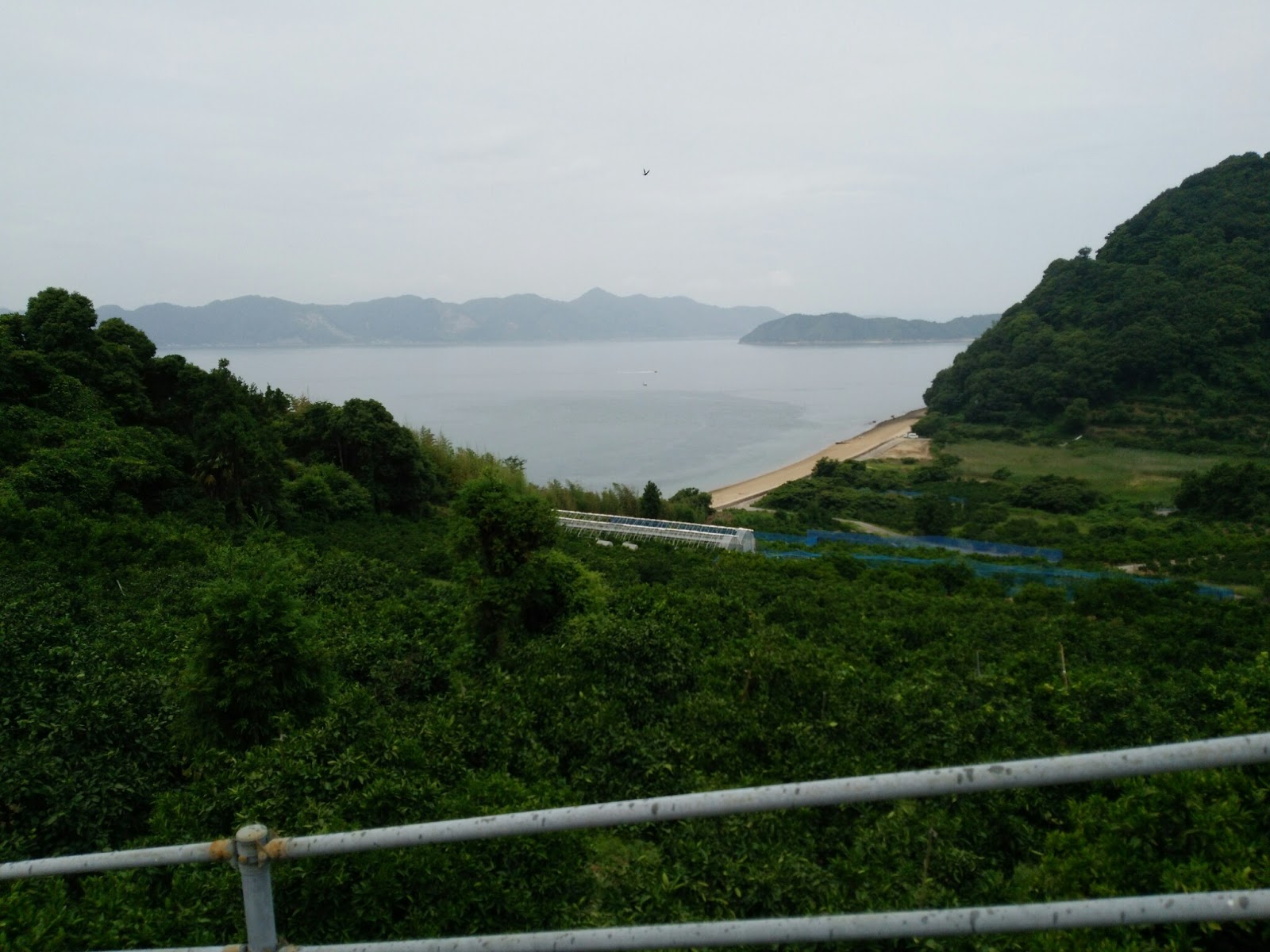 台風のせいで曇りではありますが、風は南から北へ吹き抜けていっています。PM2.5などの影響が少ない風向きです。向島、因島、生口島と、たまに降る雨以外は順調でした。