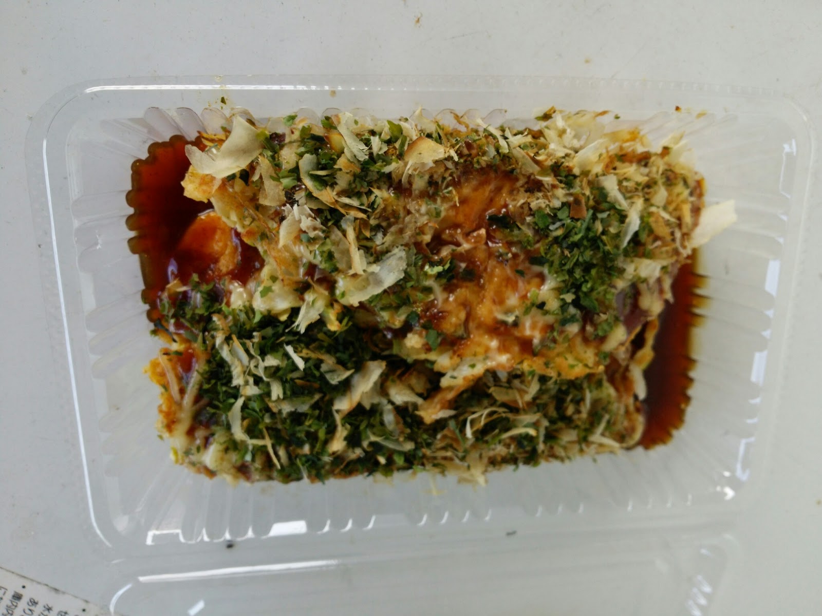 豊北の道の駅にもどって、イカいりのお好み焼き400円を無理に食べます。