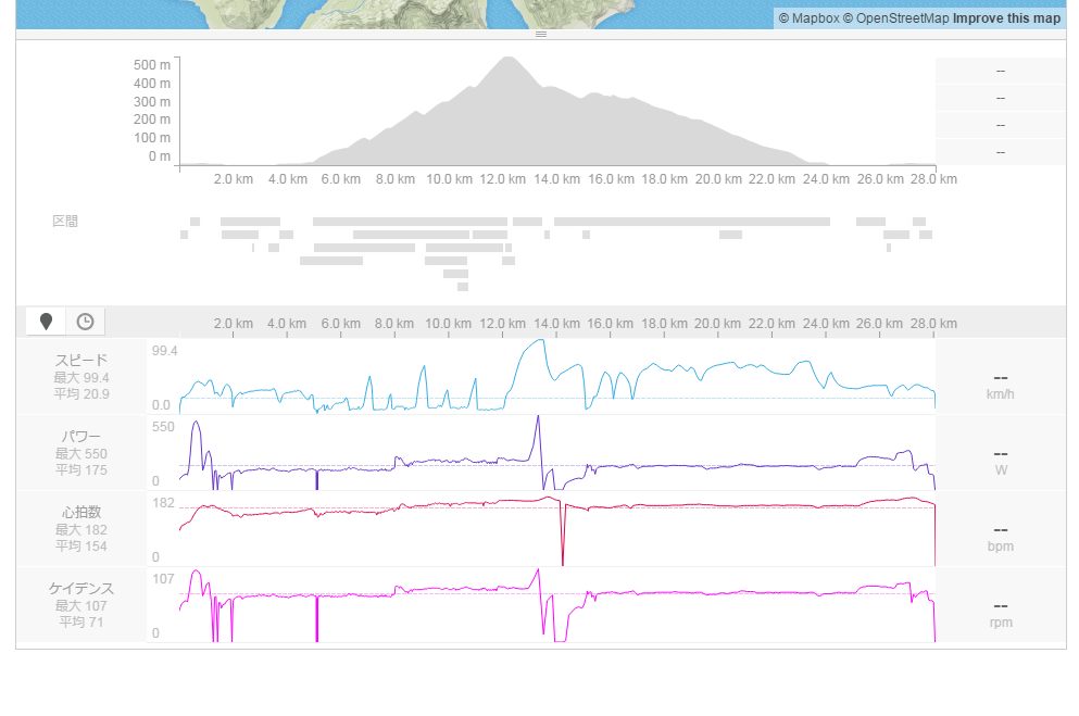 お金を払ったものはしかたがないので、最近追加されたという山上りに挑んでみました。途中でグラブルのWeb版をプレイしていてワット数などが乱高下しています。