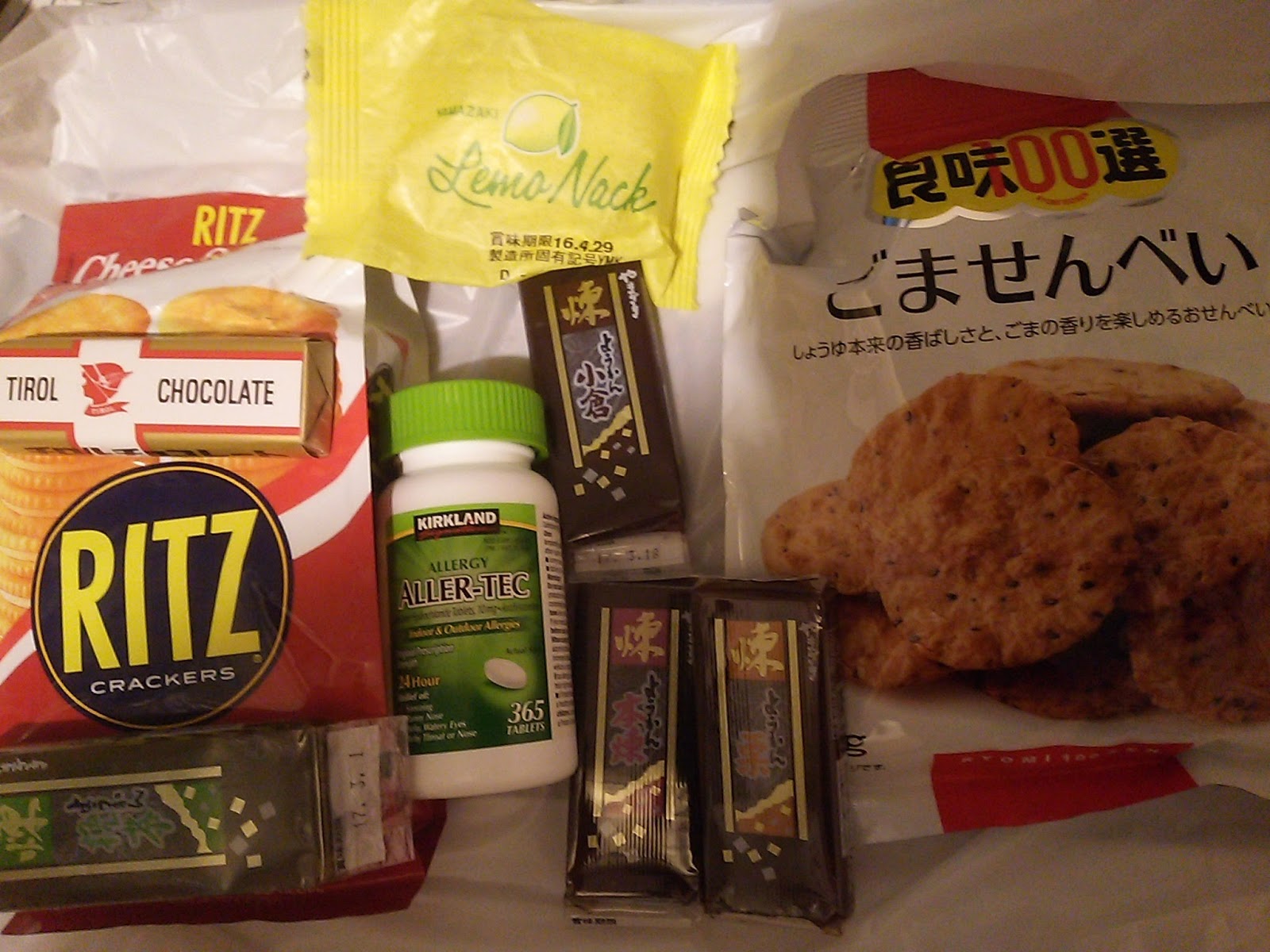 チーズリッツ。レモンケーキ。ごませんべい。チロルチョコ(3連)。ようかん4本。あとは水を3リットルとぐらいを用意していました。ようかん1本を残して完食しました。